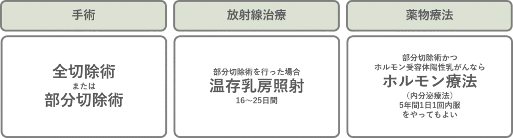 また、ホルモン受容体陽性でかつ部分切除術であった場合は手術のあとに内分泌療法(ホルモン療法)